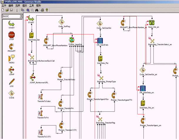 GVP提供了界面友好的功能強大的語音應用開發(fā)工具-Genesys Studio,其中預定了豐富的控件,用來實現(xiàn)菜單語音播報、DTMF收集以及對數(shù)據(jù)庫查詢等諸多功能。通過拖放的方式就可以快速的隨心所欲地設計出你所需要的語音邏輯應用流程,最終編譯產(chǎn)生用于發(fā)布的ASP或者JSP頁面。應用之間可以彼此調(diào)用,提高了語音應用的靈活性和可重用性。Genesys Studio還提供了靈活實用的調(diào)試工具,可以隨意設置斷點實時跟蹤流程的執(zhí)行情況,極大的方便了語音應用流程的調(diào)試。