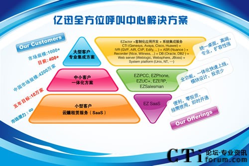 Service Software”;而“易之愛彼喜喜”及“易之風(fēng)”產(chǎn)品,顧名思義,就是億迅推出基于CESS理念的呼叫中心產(chǎn)品EZIPCC及EZPhone的中文注釋,因為簡單容易,讓客戶更喜歡;“CHANGE”不僅代表了億迅發(fā)展的這11年一直秉持創(chuàng)新與改革的經(jīng)驗哲學(xué),也代表了億迅自主研發(fā)的核心CRM產(chǎn)品“EZactor”在高端市場與主流戰(zhàn)略合作伙伴的關(guān)系,其中的“C”,是指CISCO;“H”指Huawei;“A”指“AVAYA”;“N”指Nuance;“G”指Genesys;而最后的“E”,則代表了eSOON。