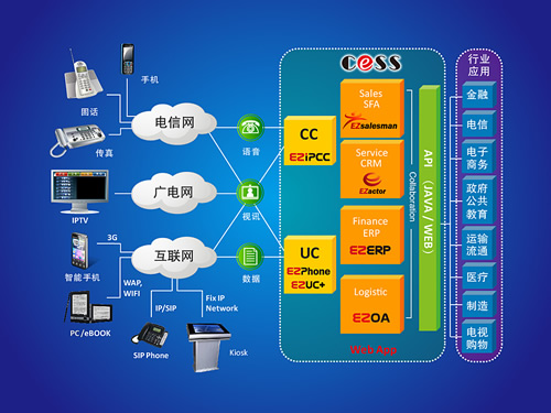 上圖: 三網(wǎng)融合下億迅的新一代客服中心可實(shí)現(xiàn)多元企企聯(lián)盟的商務(wù)活動(dòng)
