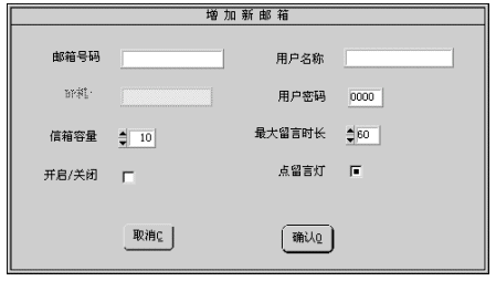 2). 除信箱號碼為必須輸入外,其它各項(xiàng)若不輸入,系統(tǒng)會按缺省值設(shè)置信箱參數(shù)。 3). 設(shè)置完成后按確認(rèn)按鈕即增加一個信箱號碼。若不想增加,按取消按鈕退出。
