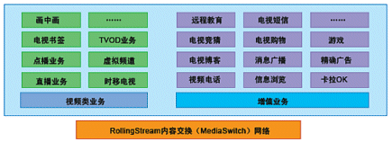 奔流(RollingStream)系統(tǒng)不僅僅支持以LiveTV、Timeshift-TV、VOD、TVOD等為基礎(chǔ)的各項功能,而且具有良好的功能上的可擴展性,在此平臺上可以支持眾多豐富多彩的增值互動業(yè)務(wù);诒剂(RollingStream)具有無限的業(yè)務(wù)增長空間,如下圖所示意: