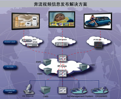 UT斯達(dá)康緊跟市場(chǎng)發(fā)展趨勢(shì)和運(yùn)營(yíng)商步伐,深入研究戶外液晶廣告業(yè)務(wù)的發(fā)展、大力推進(jìn)廣告平臺(tái)的研發(fā)。2006年,UT斯達(dá)康推出了奔流(RollingStream)視頻信息發(fā)布解決方案(如圖2所示)。奔流視頻信息發(fā)布解決方案是以奔流(RollingStream)IPTV平臺(tái)為基礎(chǔ),結(jié)合戶外液晶廣告市場(chǎng)需求,融合運(yùn)營(yíng)商以視頻為主的綜合信息發(fā)布的需求,真正運(yùn)營(yíng)級(jí)的電信級(jí)解決方案。該方案可以幫助運(yùn)營(yíng)商實(shí)現(xiàn)融合信息服務(wù)和廣告業(yè)務(wù)的統(tǒng)一運(yùn)營(yíng),幫助運(yùn)營(yíng)商開(kāi)展兼具公益性和盈利性的信息發(fā)布業(yè)務(wù),運(yùn)營(yíng)商在推進(jìn)社會(huì)信息化、造福公眾的同時(shí),通過(guò)視頻廣告的運(yùn)營(yíng),也能獲取盈利。該方案基于電信級(jí)平臺(tái)的穩(wěn)定性、安全性、擴(kuò)展性設(shè)計(jì)要求,可支持百萬(wàn)級(jí)大規(guī)模部署能力,可提供電信級(jí)質(zhì)量保證的服務(wù);該方案基于IP流媒體技術(shù),可通過(guò)IP網(wǎng)絡(luò)實(shí)時(shí)、精準(zhǔn)、互動(dòng)地投放廣告內(nèi)容,從而可以支持豐富、新穎的廣告運(yùn)營(yíng)模式;該方案基于數(shù)字多媒體技術(shù),除了可以發(fā)布視頻廣告,還可以發(fā)布圖片、文字、消息等廣告內(nèi)容。