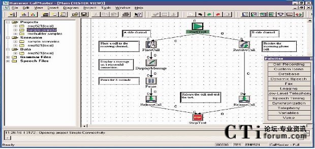呼叫中心測試的第一步就是要創(chuàng)建要被測試的業(yè)務的呼叫流程圖。可以通過一個含有標準呼叫流程圖標庫的呼叫流程圖形編輯器創(chuàng)建呼叫流程圖。每個呼叫流程的圖標都包含一段Hammer