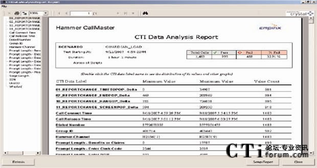 如果響應時間超過設定的預置值(閥值),或者發(fā)現(xiàn)任何其它問題時,Hammer可以把這個錯誤和它的位置記錄在數(shù)據(jù)庫中,然后實時顯示測試結果。Hammer可以模擬呼叫流程中的任何一個方面,包括DTMF按鍵音可變信息的記錄或者是為測試支持語音識別系統(tǒng)而播放大量的語音文件。Hammer專利的語音提示識別能力更可以自動檢驗在IVR和ACD/PBX系統(tǒng)中是否正確播放語音提示。