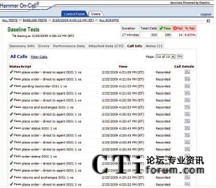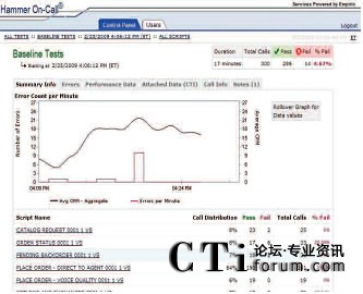 只需使用一個(gè)簡(jiǎn)單易用的Web接入就可以和Empirix測(cè)試小組一起實(shí)時(shí)跟蹤測(cè)試進(jìn)度。此外,還同時(shí)可以查看測(cè)試結(jié)果、發(fā)生失敗的類型和導(dǎo)致失敗發(fā)生的測(cè)試流量。通話全程記錄功能可以用來(lái)記錄相關(guān)通話,從而捕獲和幫助診斷發(fā)生失敗的根源。可以參考下列圖表: