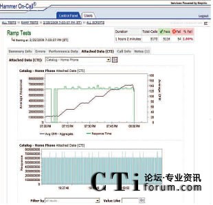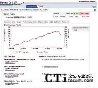 Hammer On-Call IVR測(cè)試使用各種各樣的主叫場(chǎng)景模擬真實(shí)世界用戶交互。通過(guò)改變呼叫量和呼叫場(chǎng)景的混合,Empirix測(cè)試專家可以生成指向IVR的模擬真實(shí)世界的呼叫流量。此外,在測(cè)試中,不同的呼叫測(cè)試點(diǎn)上可以使用不同的呼叫率。在測(cè)試過(guò)程中經(jīng)常會(huì)用到三種基本呼叫模型及其變體。基本測(cè)試是使用一個(gè)恒定的低呼叫率檢驗(yàn)被測(cè)環(huán)境是否已準(zhǔn)備好接受呼叫;增量測(cè)試是使用一個(gè)固定增量穩(wěn)步增加呼叫量一直到達(dá)峰值呼叫量,然后,增加呼叫量直至超過(guò)期望值,檢驗(yàn)系統(tǒng)在峰值時(shí)段內(nèi)是否有額外容量;最后,‘浸透’測(cè)試是在指定的時(shí)段內(nèi)使用一個(gè)恒定的高呼叫率檢驗(yàn)系統(tǒng)穩(wěn)定性。