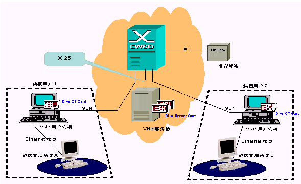 EWSD交換機提供的增強型CENTREX(虛擬集中用戶交換業(yè)務)業(yè)務平臺VNet,能夠使運營商在PSTN公網中向大客戶和重要客戶提供性能與用戶交換機PBX相似的集團用戶解決方案.由于VNet功能基于EWSD交換機, 因此能提供給用戶最大的可靠性.利用VNet豐富的性能和EWSD靈活的組網方案,在保證VNet的CERNTREX用戶享有PSTN公網的所有性能的同時,可以根據用戶的特定需求提供有針對性的解決方案,完全滿足集團用戶,商業(yè)用戶的通信需要. 此系統(tǒng)應用了Eicon公司性能卓越的Diva ISDN Server系列產品。網絡應用如圖所示: