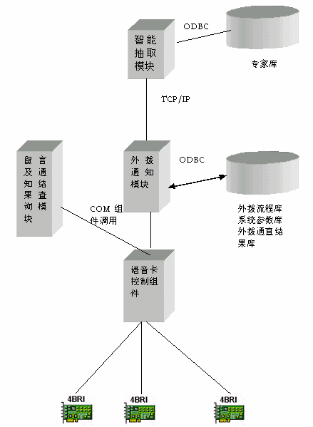 北京市建筑市場專家評標抽取通知系統(tǒng)是靈訊科技有限公司采用加拿大Eicon網(wǎng)絡公司的Diva Server 4BRI 卡開發(fā)的一套高效的外撥通知系統(tǒng),該系統(tǒng)充分體現(xiàn)了Eicon網(wǎng)絡公司 Diva Server 4BRI卡強大的語音功能以及系統(tǒng)的穩(wěn)定性,準確地識別了外撥手機的遇忙、無人、不再服務區(qū)、關機、空號等狀態(tài),實現(xiàn)了對手機狀態(tài)的全面監(jiān)控,全面解決了模擬語音卡對外撥手機信號無法判斷的問題。具體的系統(tǒng)架構如下:![]()