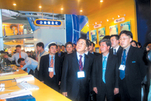 金弘基先生(前排左一)帶領(lǐng)參觀者參觀三星SDS公司在COMDEX/China 2002上的展臺(tái)。