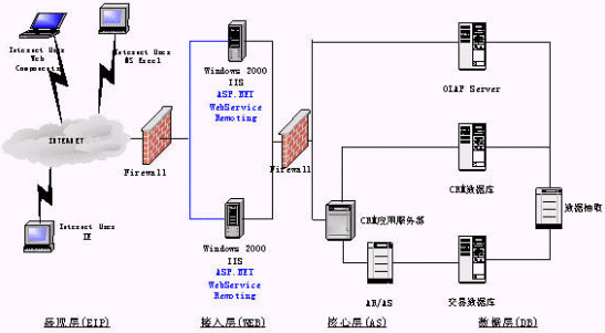 展現(xiàn)層實現(xiàn)定制化的、支持各種接入設(shè)備的統(tǒng)一消息平臺是非常必要的,它必將極大地促進公司服務(wù)產(chǎn)品的發(fā)展。在展現(xiàn)層我們還強調(diào)企業(yè)信息門戶的建立:信息不是孤立的,需要一個統(tǒng)一的、互動的、個性化的、全面的綜合表現(xiàn)形式,以更方便公司人員對信息的獲取,作出正確的決策。使用ASP.Net和OfficeXP Web Components OLAP展示工具,并能有機的與辦公自動化工具結(jié)合起來。