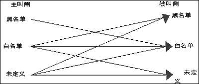 主/被叫黑白名單是號碼防火墻的一種簡易實(shí)現(xiàn)方式。黑白名單能夠在有限分類的情況下,提供相對豐富的權(quán)限控制能力。具體說,黑白名單就是把電話號碼分為三類,并定義這些分類之間的呼叫限制。(如圖2)