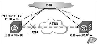 利用這一機(jī)制,網(wǎng)絡(luò)管理員也可以為每個撥號端配置一條備份路由,這個備份路由可以通往IP網(wǎng)方向也可以通向PSTN方向,當(dāng)主路由不通時路徑選擇算法就將自動把下一次呼叫切換到備份路由,實(shí)現(xiàn)IP-PSTN切換。