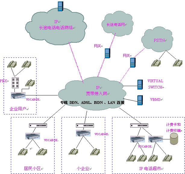 ISP及寬帶網(wǎng)絡(luò)運(yùn)營(yíng)商的本地電話(huà)接入網(wǎng)絡(luò),采用單級(jí)單域結(jié)構(gòu),在網(wǎng)內(nèi)安裝VIRTUALSWITCH虛擬交換系統(tǒng),它作為整個(gè)本地電話(huà)接入網(wǎng)絡(luò)的網(wǎng)守,以集中方式管理域內(nèi)的所有網(wǎng)關(guān)(VOCA-BOX),執(zhí)行地址翻譯,呼叫控制,帶寬管理,域管理等功能以及呼叫建立、拆除控制和呼叫管理等功能。在網(wǎng)內(nèi)安裝后臺(tái)計(jì)費(fèi)、認(rèn)證系統(tǒng)(VBMS),對(duì)各個(gè)語(yǔ)音終端實(shí)現(xiàn)計(jì)費(fèi)認(rèn)證及結(jié)算,同時(shí)完成號(hào)碼分配及網(wǎng)絡(luò)管理的功能。