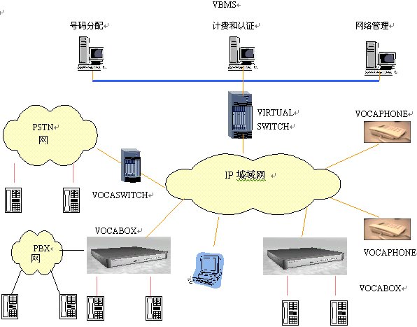 本方案中,企業(yè)電話網(wǎng)絡(luò)或者駐地網(wǎng)客戶的電話網(wǎng)絡(luò)作為大客戶通過(guò)IP方式或者通過(guò)VOCASWITH的E1端口接入到本地電話接入網(wǎng)絡(luò)。安裝VIRTUALSWITCH網(wǎng)關(guān)代理系統(tǒng),它作為整個(gè)本地電話接入網(wǎng)絡(luò)的網(wǎng)守(GATEKEEPER),以集中方式管理域內(nèi)的所有網(wǎng)關(guān)(VOCA-BOX)。