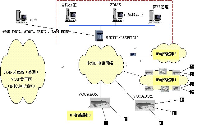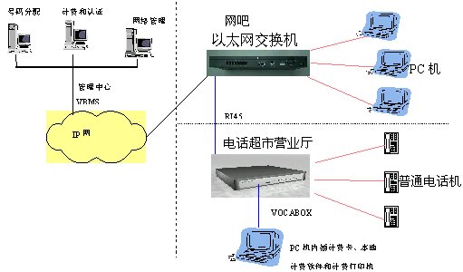 此方案的特點(diǎn)是將電話終端深入到公用電話的超市,用戶可以撥打IP長(zhǎng)途電話、PSTN普通電話用戶及移動(dòng)電話用戶,并在用戶端通過(guò)VOCA-BOX語(yǔ)音網(wǎng)關(guān)、計(jì)費(fèi)卡和計(jì)費(fèi)軟件實(shí)現(xiàn)本地營(yíng)業(yè)廳立即計(jì)費(fèi)的要求。在運(yùn)營(yíng)商的管理中心通過(guò)配置VBMS系統(tǒng)實(shí)現(xiàn)后臺(tái)集中計(jì)費(fèi)認(rèn)證功能,用于管理各個(gè)營(yíng)業(yè)中心的VOCA-BOX語(yǔ)音網(wǎng)關(guān),各營(yíng)業(yè)中心的VOCA-BOX語(yǔ)音網(wǎng)關(guān)提供認(rèn)證計(jì)費(fèi)信息給VBMS,計(jì)費(fèi)類型可按實(shí)際的需求配置如:預(yù)付費(fèi)、后付費(fèi)等。此方案可以擴(kuò)大ISP及寬帶網(wǎng)絡(luò)運(yùn)營(yíng)商的業(yè)務(wù)市場(chǎng),增加ISP及寬帶網(wǎng)絡(luò)運(yùn)營(yíng)商的收益。