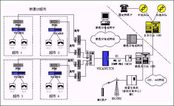 用戶端使用帶4~8個(gè)模擬端口的VOCABOX實(shí)現(xiàn)語(yǔ)音接入IP數(shù)據(jù)網(wǎng)。在局端采用的是聯(lián)通交換局中大量部署的華為C&C08 交換機(jī)的E1數(shù)字中繼接口資源與VOCASWITCH對(duì)接,并利用光端機(jī)加網(wǎng)橋連接聯(lián)通已有的光纖,實(shí)現(xiàn)聯(lián)通IP超市接入聯(lián)通電話網(wǎng)絡(luò)。