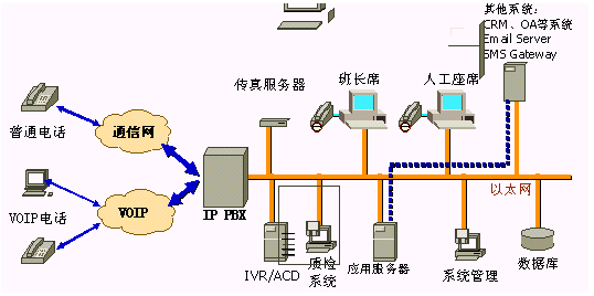 IP PBX系統(tǒng)代替?zhèn)鹘y(tǒng)PBX交換機(jī)系統(tǒng),實(shí)際上是一個(gè)SIP或H.323交換機(jī),內(nèi)部分機(jī)采用純IP電話,提供呼叫路由、話務(wù)員分組管理、呼叫控制等功能,支持市場(chǎng)上主流IP