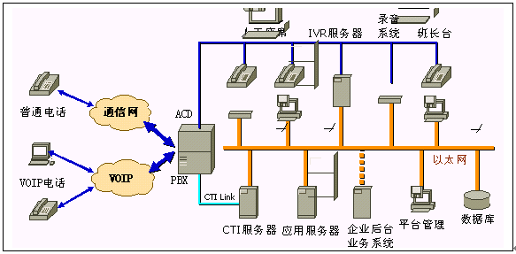 。。《XCCP呼叫中心系統(tǒng)》平臺(tái),主要由PBX交換機(jī)、CTI服務(wù)器、IVR系統(tǒng)、應(yīng)用服務(wù)器、數(shù)據(jù)庫服務(wù)器、TTS系統(tǒng)、語音識(shí)別系統(tǒng)和座席系統(tǒng)等硬件設(shè)備和系統(tǒng)應(yīng)用軟件組成。它以電話服務(wù)為主要服務(wù)方式、結(jié)合計(jì)算機(jī)信息系統(tǒng)的資料數(shù)據(jù),為用戶提供全方位的服務(wù)。