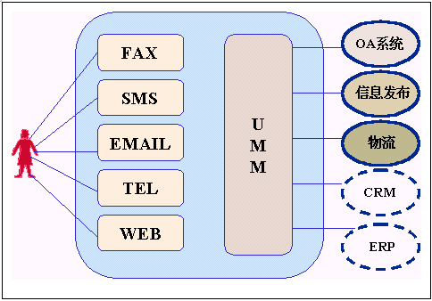 ·UMM(Uni Message Manager ) 統(tǒng)一消息管理,它有兩個任務,一個是根據(jù)外部傳過來信息的不同,交給后臺不同的信息處理系統(tǒng)處理,另一個是將后臺不同的信息處理系統(tǒng),根據(jù)需要通過不同的媒介發(fā)布給用戶