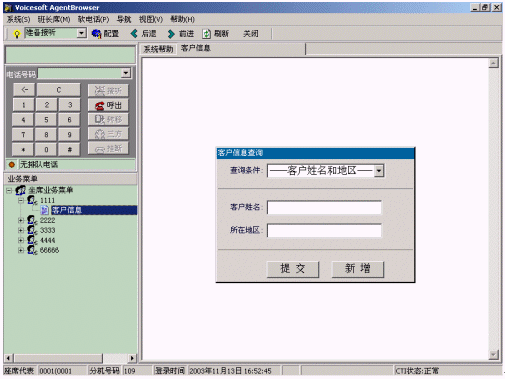 ·語音數(shù)據(jù)同步:當電話轉(zhuǎn)到該座席上時,業(yè)務界面中將根據(jù)用戶的電話號碼以及操作信息,提示座席客戶資料