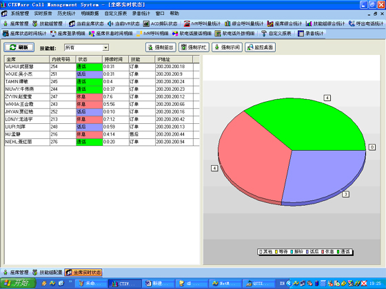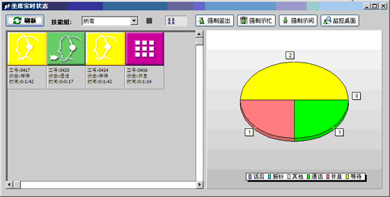 當(dāng)前座席狀態(tài):能夠提供座席的狀態(tài)表示,狀態(tài)持續(xù)時(shí)間,對(duì)應(yīng)的技能組,對(duì)應(yīng)的分機(jī)號(hào)碼,對(duì)應(yīng)的IP地址等信息。可以對(duì)任何一個(gè)座席進(jìn)行強(qiáng)制簽出、強(qiáng)制示忙、強(qiáng)制示閑操作。可以對(duì)任意座席進(jìn)行屏幕監(jiān)控操作(無(wú)需任何第三方軟件)。