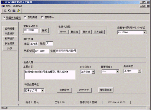 系統(tǒng)提供人工座席代表直接與居民對(duì)話,記錄舉報(bào)、投訴、批評(píng)、建議等情況,解釋政府相關(guān)政策法規(guī);可以將用戶來(lái)電直接將轉(zhuǎn)到各政府部門和和市(縣)政府領(lǐng)導(dǎo),以應(yīng)對(duì)緊急事件的發(fā)生;可通過(guò)外撥市民(人民群眾)電話,將緊急或疑難問(wèn)題的處理結(jié)果主動(dòng)反饋給百姓;或利用外撥功能開(kāi)展民意調(diào)查,調(diào)研,幫助政府制定出最符合群眾利益的政策,更好地實(shí)踐"三個(gè)代表"重要思想和帶領(lǐng)人民群眾全面建設(shè)小康社會(huì)。