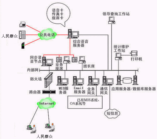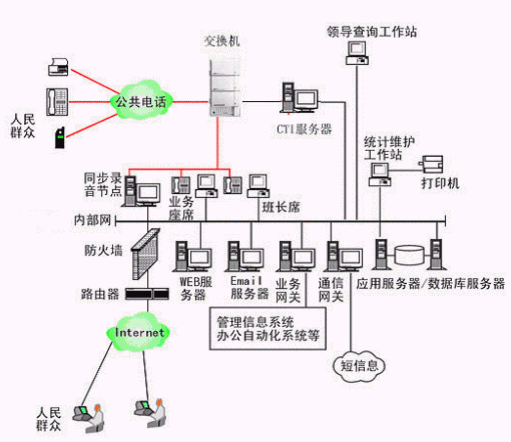 本系統(tǒng)物理結(jié)構(gòu)由排隊(duì)交換機(jī)、CTI服務(wù)器、IVR(交互式語音應(yīng)答)/IFR(交互式傳真應(yīng)答)服務(wù)器、業(yè)務(wù)代表座席(邏輯上分為:普通業(yè)務(wù)代表座席、專家座席、WEB座席等)、班長(zhǎng)座席、統(tǒng)計(jì)維護(hù)管理工作站、因特網(wǎng)(WEB)服務(wù)器、電子郵件(EMAIL)服務(wù)器、數(shù)據(jù)庫/應(yīng)用服務(wù)器、錄音留言工作站、領(lǐng)導(dǎo)查詢工作站、業(yè)務(wù)網(wǎng)關(guān)服務(wù)器、通信網(wǎng)關(guān)、網(wǎng)絡(luò)系統(tǒng)等和應(yīng)用軟件構(gòu)成。