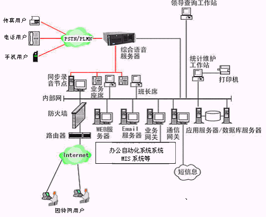 本多媒體客戶服務中心呼叫中心的物理結構由帶語音板卡的工控機或智能型可編程交換機或排隊交換機、CTI服務器、IVR(交互式語音應答)/IFR(交互式傳真應答)服務器、業(yè)務代表座席(邏輯上分為:普通業(yè)務代表座席、專家座席、WEB座席等)、班長座席/質檢座席、統(tǒng)計維護管理工作站、因特網(wǎng)(WEB)服務器、電子郵件(EMAIL)服務器、數(shù)據(jù)庫/應用服務器、錄音留言工作站、領導查詢工作站、業(yè)務網(wǎng)關服務器、網(wǎng)絡系統(tǒng)等和應用軟件構成。