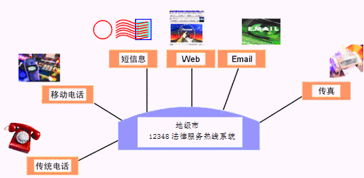 居民利用電話、傳真、手機等撥打某一特服號碼(如12348)進入地級市法律服務(wù)熱線系統(tǒng),本系統(tǒng)依托地級市司法行政部門/法院各類業(yè)務(wù)技術(shù)支持系統(tǒng)和網(wǎng)絡(luò)系統(tǒng),通過人工受理或自動語音服務(wù)等方式全天24小時不間斷地為人民群眾提供各種法律服務(wù);形成了對外服務(wù)于百姓的無形窗口,對內(nèi)管理、分析、決策系統(tǒng)相結(jié)合的多媒體呼叫中心。