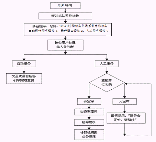 本系統(tǒng)將需轉(zhuǎn)入人工服務(wù)的用戶(電話)語音線路,根據(jù)一定的分配算法,將人民群眾打入的電話合理地分配給后臺的座席操作人員進行處理,使系統(tǒng)的工作得以合理的分配。