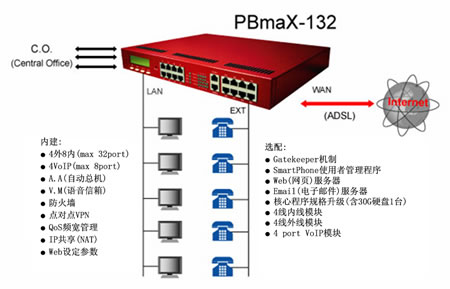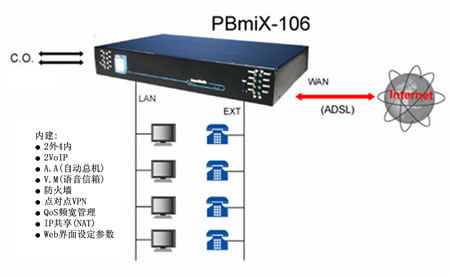 在21世紀(jì)的今日,隨著網(wǎng)絡(luò)應(yīng)用的普及,無論是個人或企業(yè)對于交換機的觀念若仍拘泥于傳統(tǒng)的思維,將是落伍的。免費網(wǎng)絡(luò)電話、分散式系統(tǒng),將是傳統(tǒng)交換機 在增加語音信箱/自動總機功能之后,系統(tǒng)機制的重大變革。本公司推出的PBmaX/PBmiX系列IP-PBX,不但將上述所有功能整合于一體,進一步可內(nèi)建公司VPN、Web服務(wù)器、GateKeeper等功能,呈現(xiàn)出數(shù)字交換機的全新風(fēng)貌,并將新的電話使用觀念帶進企業(yè)、SOHO辦公室與家庭內(nèi)。