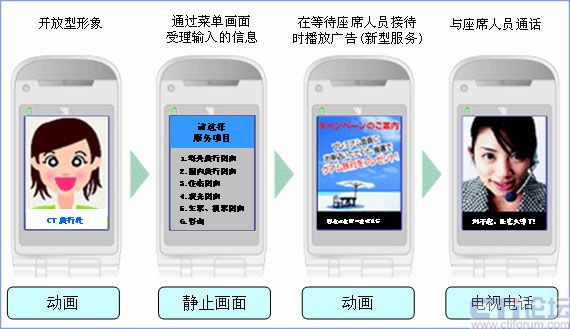 以往的IVR根據(jù)選擇項(xiàng)、層數(shù),必須多遍聽(tīng)取語(yǔ)音內(nèi)容才能找到預(yù)期的菜單,成了一大課題。視頻呼叫中心則在FOMA的畫面上顯示服務(wù)菜單,通過(guò)選擇號(hào)碼可以簡(jiǎn)化聽(tīng)取語(yǔ)音的過(guò)程。而且,在連接客服人員的電話等待時(shí)間中可以播放廣告。通過(guò)靈活運(yùn)用這些功能,提高了IVR的操作性,提供了新型廣告宣傳的機(jī)會(huì)。