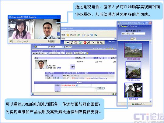 通過(guò)“FOMA”的電視電話服務(wù),可以實(shí)現(xiàn)面對(duì)用戶的表情進(jìn)行服務(wù)。而且,例如,可以實(shí)時(shí)把握故障發(fā)生地點(diǎn)等只用語(yǔ)言無(wú)法準(zhǔn)確傳遞的信息。進(jìn)而,客服人員可以通過(guò)FOMA的電視電話功能送出動(dòng)畫、靜止畫面,利用這些畫面說(shuō)明情況。通過(guò)靈活運(yùn)用這些功能,為實(shí)現(xiàn)顧客和企業(yè)之間的熱情友好、高效細(xì)致的通信提供支持。