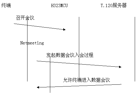采用帶外方式,數(shù)據(jù)與音頻視頻流分開,各自占用帶寬。與終端和MCU無任何關(guān)系。如果用戶想召開數(shù)據(jù)會(huì)議,需要單獨(dú)的一臺(tái)PC機(jī)來進(jìn)行數(shù)據(jù)的接受與傳送,所有需要數(shù)據(jù)會(huì)議功能的用戶的PC機(jī)都連接到一個(gè)T.120服務(wù)器上。目前常用的終端軟件是Netmeeting軟件。數(shù)據(jù)占用單獨(dú)的帶寬,不擠占音視頻的帶寬。會(huì)議建立過程為: