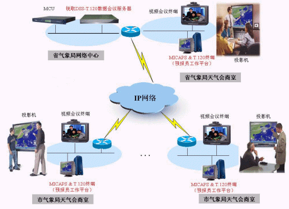 下圖為DSS-T.120數(shù)據(jù)會(huì)議服務(wù)器在某省氣象部門視頻會(huì)議系統(tǒng)中的典型應(yīng)用案例。