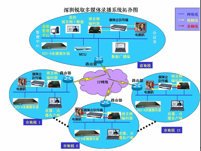 黑龍江省地稅采用了華為產(chǎn)品搭建了視頻會(huì)議系統(tǒng),實(shí)現(xiàn)了黑龍江省地稅和13個(gè)地市的電視電話會(huì)議功能,能夠?qū)崿F(xiàn)13個(gè)地市和省地稅之間的圖像、語(yǔ)音和數(shù)據(jù)的交互通訊,在此基礎(chǔ)上配置了銳取14臺(tái)DSS-R-C100多媒體錄播系統(tǒng)(省地稅與各市地稅各1臺(tái)),該系統(tǒng)可以輔助視頻會(huì)議系統(tǒng)完成視頻會(huì)議的錄制、直播和點(diǎn)播功能,錄制、直播和點(diǎn)播的內(nèi)容包括了主會(huì)場(chǎng)圖像、分會(huì)場(chǎng)圖像以及聲音和數(shù)據(jù)信號(hào)。