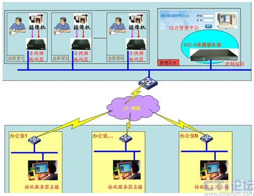 基于上述的需求,經過調研選用深圳銳取錄播服務器產品完成上述的功能需求。如圖所示,通過放置在每個會議室考場內的攝像機,將竟聘者的圖像與聲音傳輸?shù)较噙B接的銳取公司的視音頻編碼器上,通過編碼器的編碼將采集的信號(通過內部網(wǎng)絡)傳輸?shù)胶笈_的管理平臺上的DSS-R錄播服務器中。服務器的直播模塊將從音視頻編碼器接收到的信號分發(fā)到網(wǎng)絡中,每個接入內網(wǎng)絡的辦公室內里的電腦通過專有客戶端接收考場實時內容,實現(xiàn)了真正意義上的接受機關廣大干部群眾的監(jiān)督考察。同時錄播服務器內置的錄制模塊,將收到的信號內容解碼錄制保存(服務器內有可供存儲的硬盤),為日后干部的選擇做到了有理可依,有據(jù)可查。