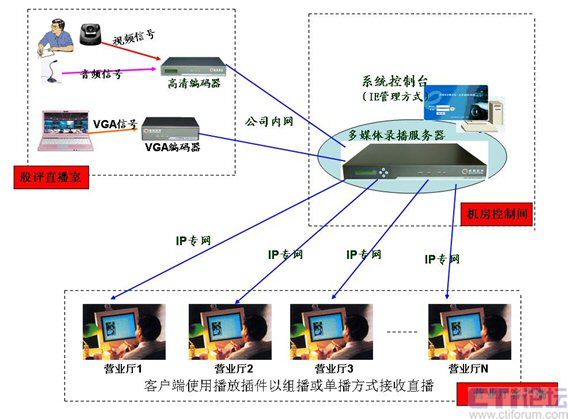 如上圖所示,在多媒體股評直播室中,股評師的講解圖像和聲音以及電腦中分析數(shù)據(jù)同步傳輸采集到控制機房中,通過多媒體錄播服務器直播模塊的組播方式將信息傳達給全國遍布的營業(yè)網點,實現(xiàn)股評直播的需求。(權威股評師將在每天下午股市休市后對一天當中股票大盤做一次全面的分析,并對本周或某行業(yè)的形式做一個全面的總結,并對未來形勢做出判斷。)