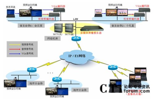 項(xiàng)目中采用了一套銳。ǚ植际剑┒嗝襟w錄播系統(tǒng),其中多媒體錄播服務(wù)器一臺(tái),部署在網(wǎng)絡(luò)機(jī)房;兩套編碼器分別部署在會(huì)議室和小禮堂,編碼器從視頻會(huì)議終端獲取視音頻及雙流信號(hào),并通過(guò)IP網(wǎng)絡(luò)發(fā)送給機(jī)房?jī)?nèi)多媒體錄播服務(wù)器,由多媒體錄播服務(wù)器實(shí)現(xiàn)視頻會(huì)議的錄制、直播和點(diǎn)播,該服務(wù)器支持2組會(huì)議并發(fā)錄播,可滿足2組并發(fā)視頻會(huì)議的錄播需要。分會(huì)場(chǎng)及不具備視頻會(huì)議終端的地方,可使用電腦登陸多媒體錄播服務(wù)器來(lái)接收會(huì)議的實(shí)時(shí)直播或在會(huì)后進(jìn)行點(diǎn)播。