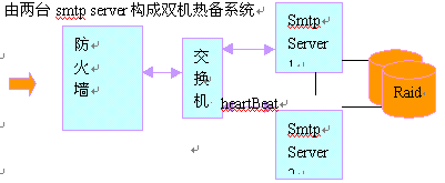2. 2個(gè)smtp server可以構(gòu)成負(fù)載均衡,同時(shí)構(gòu)成雙機(jī)熱備份,正常情況下,smtp流量平均分配到兩臺(tái)smtp server;一旦其中一臺(tái)出現(xiàn)故障,另外一臺(tái)將自動(dòng)接管smtp服務(wù)。