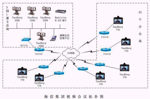 山東海信集團(tuán)有限公司會(huì)議電視項(xiàng)目以海信大廈為中心,覆蓋各個(gè)省的35個(gè)分支機(jī)構(gòu)。充分利用自己網(wǎng)絡(luò)資源的優(yōu)勢(shì),采用ITU(國(guó)際電聯(lián))的H。323標(biāo)準(zhǔn)。于-2004-年初經(jīng)過(guò)系統(tǒng)方案的征集、產(chǎn)品的反復(fù)測(cè)試,最終確定了由華夏科技代理的挪威TANDBERG的視頻終端,并于2004年6月份簽訂了一期采購(gòu)合同,共計(jì)36套視頻終端。