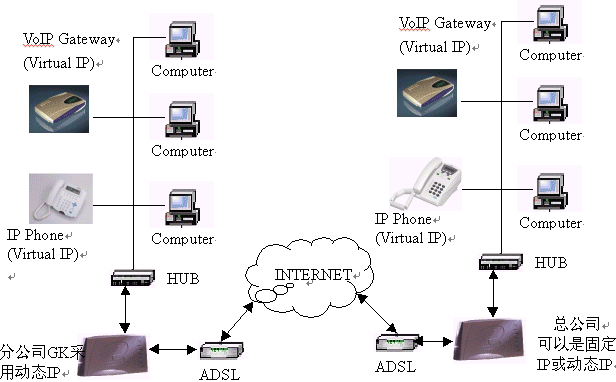 二、應(yīng)用說(shuō)明:完全基于企業(yè)現(xiàn)有網(wǎng)絡(luò)環(huán)境架設(shè)VOIP系統(tǒng),企業(yè)的各分支機(jī)構(gòu)只需申請(qǐng)ADSL寬帶網(wǎng)絡(luò)(有條件的企業(yè)可申請(qǐng)專線及固定IP地址,則系統(tǒng)完全獨(dú)立),安裝晶卡開發(fā)的NOZA網(wǎng)守、IP話機(jī)或USB手柄電話,就可實(shí)現(xiàn)免費(fèi)通話。