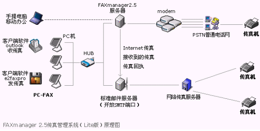 FAXmanager 2.5支持網(wǎng)絡(luò)傳真發(fā)送,具有內(nèi)嵌的網(wǎng)絡(luò)傳真服務(wù),價(jià)格比IP電話更加低廉。FAXmanager 2.5企業(yè)郵件管理系統(tǒng)有支持普通Modem的普通版本Lite版本,最多可以支持4只Modem,在局域網(wǎng)中的應(yīng)用請參見如下示意圖: