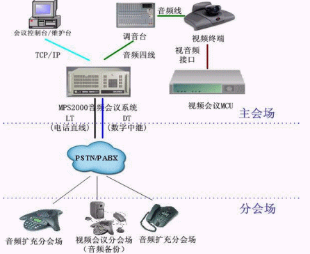 - MPS2000音頻會(huì)議系統(tǒng)通過(guò)音頻四線(xiàn)接口與主會(huì)場(chǎng)調(diào)音臺(tái)相連,保證視頻MCU中的音頻與音頻會(huì)議系統(tǒng)中的音頻互通。