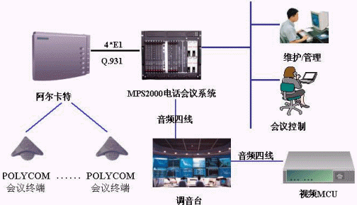 國(guó)電中心的音頻電話(huà)會(huì)議系統(tǒng)采用MPS2000電話(huà)會(huì)議系統(tǒng)。MPS2000電話(huà)會(huì)議系統(tǒng)通過(guò)4個(gè)E1與阿爾卡特的4400交換機(jī)相連,采用Pri信令,用戶(hù)通過(guò)POLYCOM的會(huì)議終端機(jī)參加會(huì)議;MPS2000電話(huà)會(huì)議系統(tǒng)通過(guò)音頻四線(xiàn)與調(diào)音臺(tái)相連,并通過(guò)調(diào)音臺(tái)與視頻MCU相連,同時(shí)MPS2000電話(huà)會(huì)議系統(tǒng)通過(guò)以太網(wǎng)與其內(nèi)部的局域網(wǎng)相連,同時(shí)在局域網(wǎng)內(nèi)設(shè)置一臺(tái)維護(hù)終端用于對(duì)系統(tǒng)的維護(hù)管理,會(huì)議控制臺(tái)通過(guò)WEB方式對(duì)會(huì)議進(jìn)行控制。
