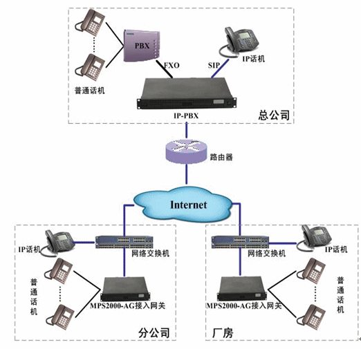 各分公司根據(jù)實(shí)際分機(jī)數(shù)配置相應(yīng)的接入網(wǎng)關(guān)或IP話機(jī)。接入網(wǎng)關(guān)和IP話機(jī)通過(guò)Internet注冊(cè)到位于總公司的IP-PBX上,實(shí)現(xiàn)了總部電話和分公司、廠房電話之間的通信、號(hào)碼直撥、來(lái)電顯示等功能。