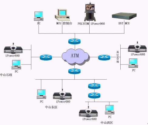 中山公安項目使用一臺DST H.323 MCS 3048/DFG的MCU、25套IPOWER600 SBRI終端和一套IPOWER900終端,目前終端使用4.01.408版本,通過的是IP OVER ATM網(wǎng)絡,到每個會場的帶寬足夠---至少10M,會議召開速率為768Kbps。市局會議中心采用IPOWER900,其它25個分局會場都使用IPOWER600。