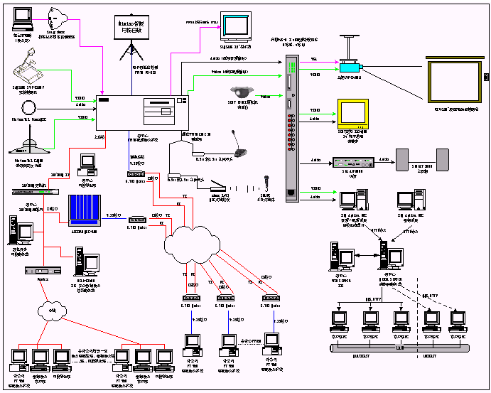 1、 電視會議系統(tǒng)包括一臺MCU和13臺iPower900,通過IP網(wǎng)絡(luò)和E1專線兩種線路連接。為了將視頻會議的功能進(jìn)行擴(kuò)展,我們增加了多種外圍設(shè)備,包括:實物投影儀、白板掃描儀、無線話筒、DV31攝像機等輸入設(shè)備,彩色電視機、三菱投影機和功放、音箱等輸出設(shè)備以及8×4視頻切換矩陣。