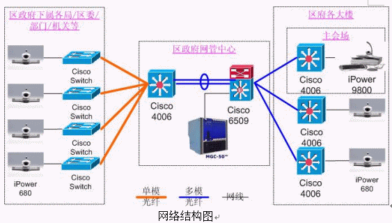 9800,分會場使用iPower 680。網(wǎng)管中心安放一臺Polycom 公司的MGC-50(多點(diǎn)會議控制單元),用于對全網(wǎng)終端的控制,實現(xiàn)多點(diǎn)間、點(diǎn)對點(diǎn)會議。各視頻設(shè)備通過網(wǎng)線連接在各主要交換機(jī)上。
