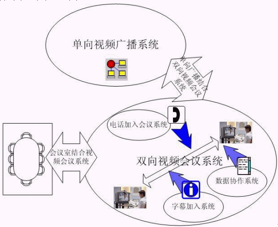 雙向視頻會議系統(tǒng)是實現(xiàn)視頻會議基本功能的主要系統(tǒng),其他均為輔助的子系統(tǒng)。